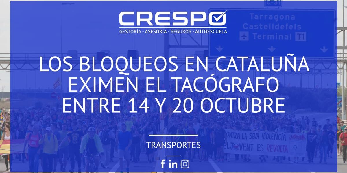 Desde el Ministerio de Fomento se ha publicado el jueves 31 de octubre en el Boletín Oficial del Estado (BOE) una Resolución Ministerial que establece una exclusión temporal de los tiempos de conducción y descanso en los transportes de mercancías y viajeros por carretera, cuyas operaciones se hayan realizado total o parcialmente por Cataluña entre los días 14 y 20 de octubre, ambos incluidos. Esta medida surge con el fin de paliar la problemática que se había producido a raíz de la sentencia pública del Tribunal Supremo contra dirigentes catalanes del pasado 14 de octubre.